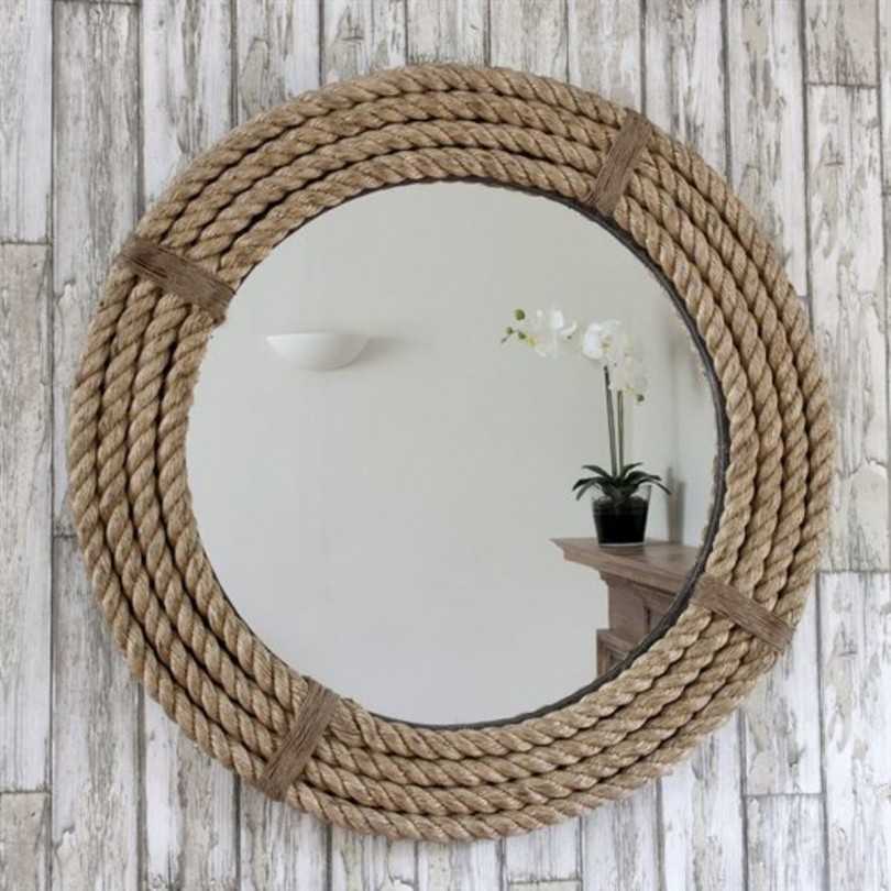 На фото овальное зеркало, декорированное веревочным канатом на стене в прихожей.