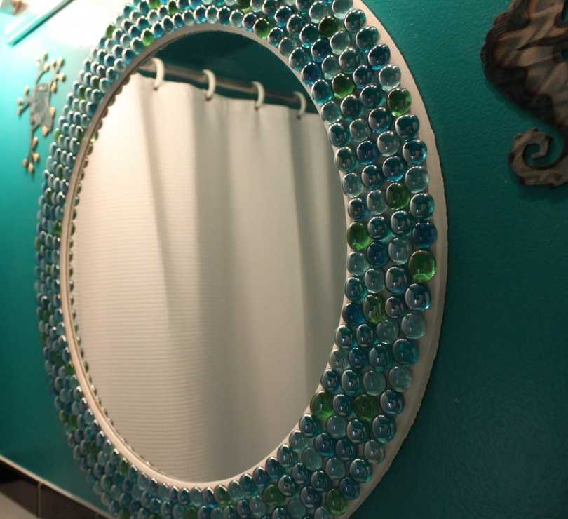 С помощью индивидуального декора зеркала, получается придать ванной законченности, продуманности и особого колорита. Преобразить данное изделие можно бисером, прозрачными бусинами, декоративными пуговицами, камушками, ракушками или применить технику декупажа.