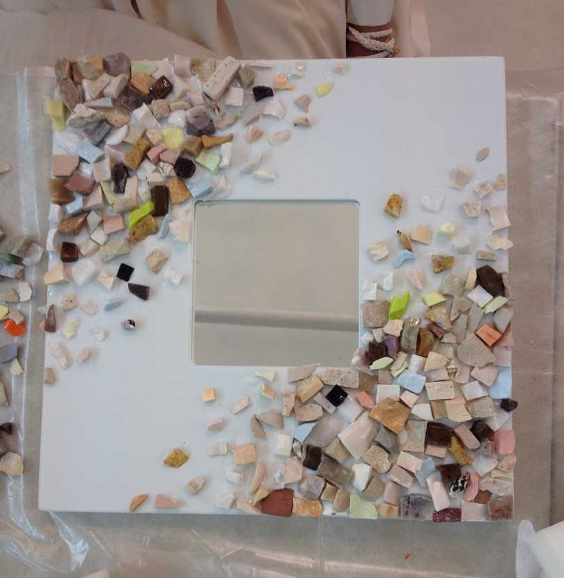 - На поверхность нанести клей и поочередно укладывать элементы декора, формируя рисунок. Работа по созданию орнамента представляет собой трудоемкий процесс, ведь мастеру нужно соблюдать определенный баланс и лаконичность в распределении ракушек, камней, бусин.