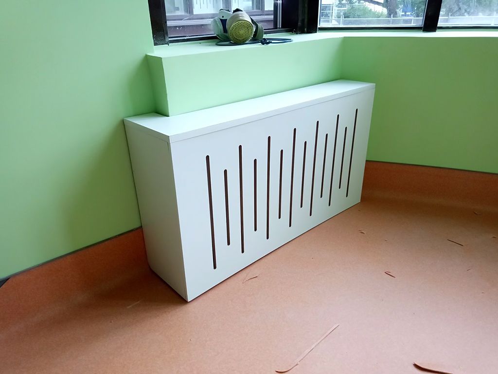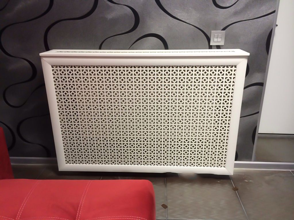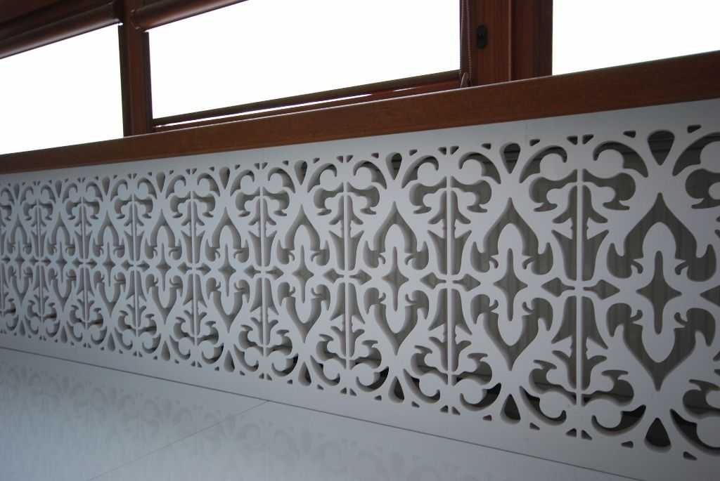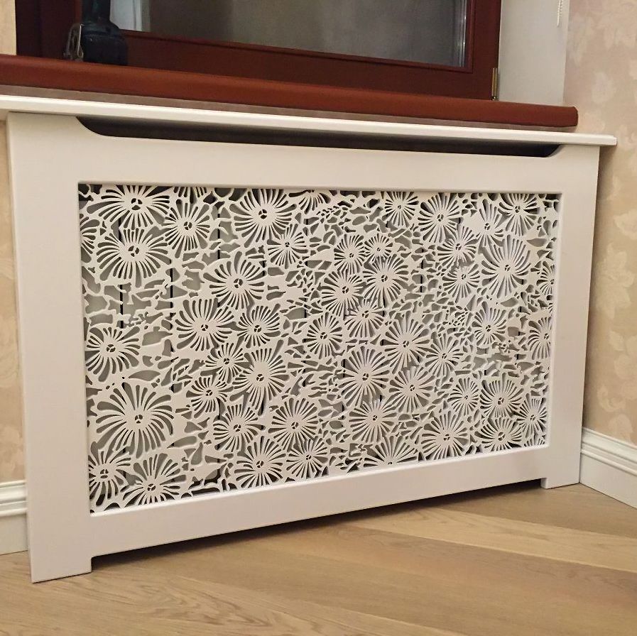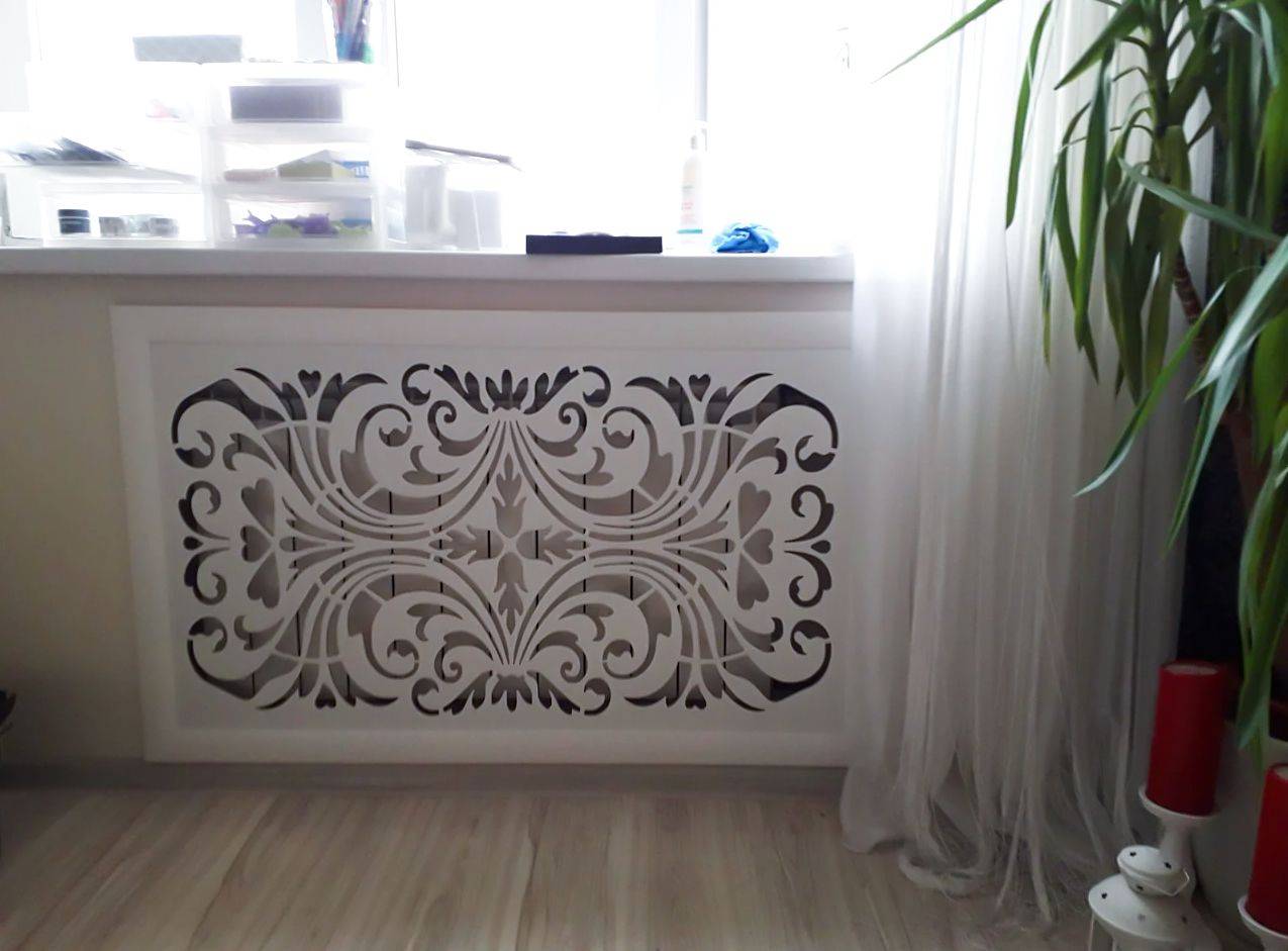 Разработка технологии изготовления МДФ-панелей позволила получать более дешевые ограждения для батарей, чем экраны из натуральной древесины. Из этого качественного материала удается изготовить решетки любой формы и цвета. Особой декоративностью обладают прорезные экраны, которые в зависимости от предпочтений заказчика могут подходить под интерьер или, наоборот, контрастировать с ним. С помощью программируемых станков удается воспроизвести любой эскиз рисунка со стопроцентной точностью. На заказ могут изготовить декоративные экраны для радиаторов отопления из МДФ-плиты по эскизу клиента.