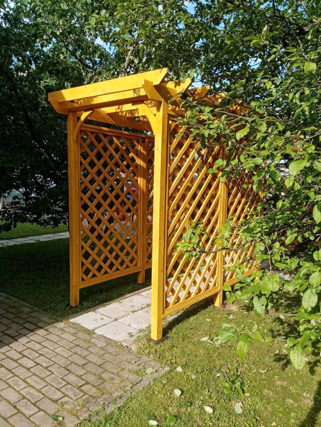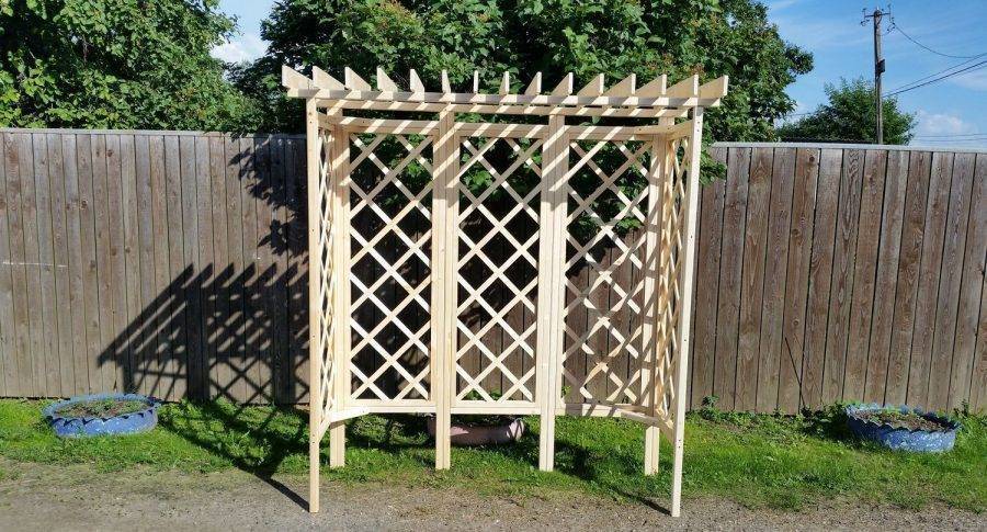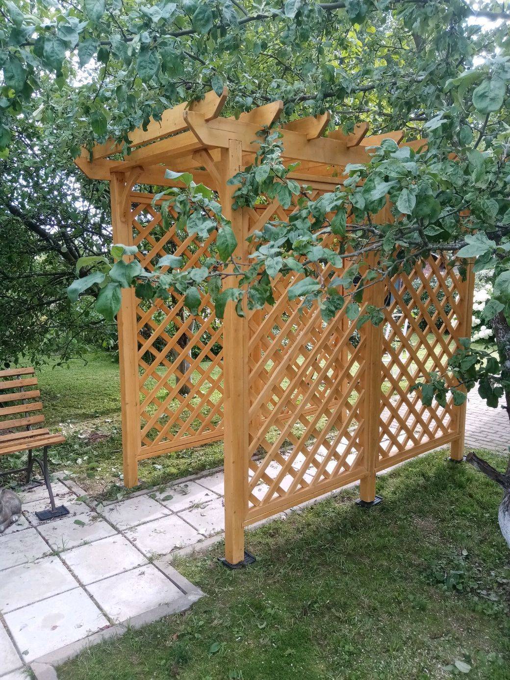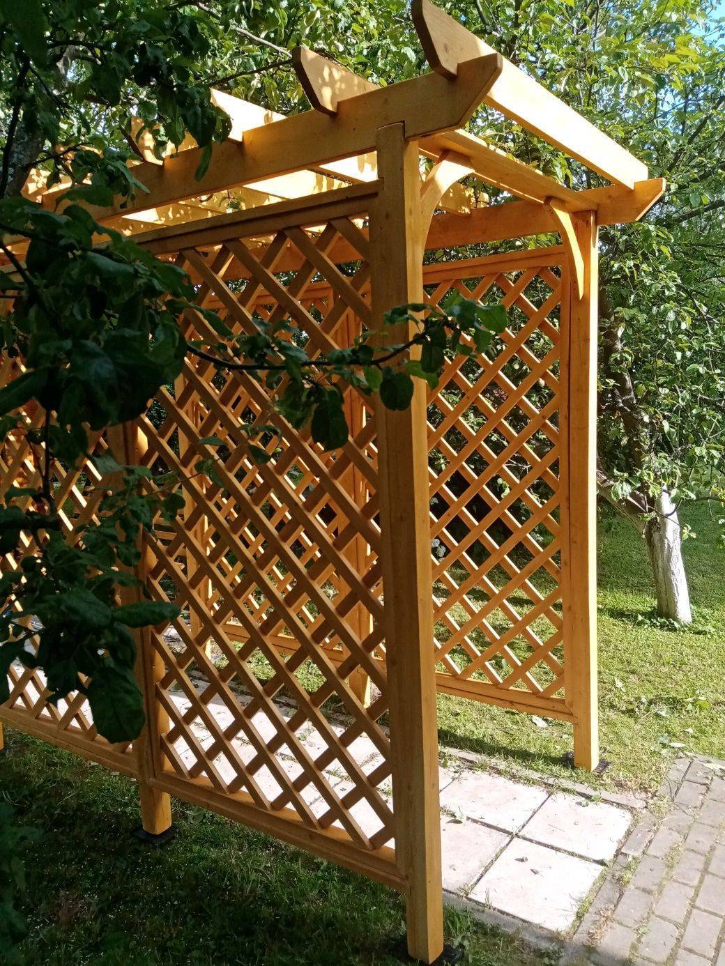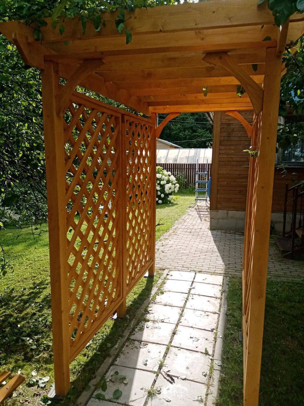 5. Навес перголы готов. Далее, при желании можно декорировать боковые части конструкции при помощи шпалерных панелей. Они крепятся к опорным стойкам перголы