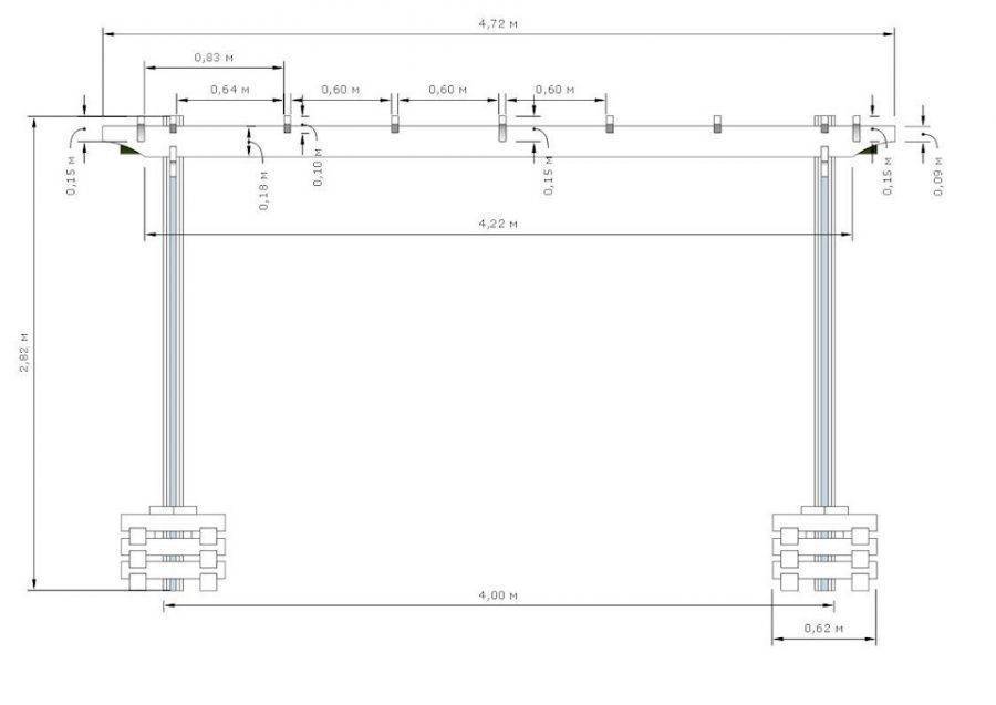 1. Опорные стойки перголы изготавливаются из бруса 10×10 или 15×15 см, который отпиливается согласно чертежу необходимой длины, чтобы получилась конструкция нужной высоты. Стойки крепятся в анкерах при помощи специальных винтов – глухарей. Вертикальность расположения стоек также определяется при помощи спиртового уровня.