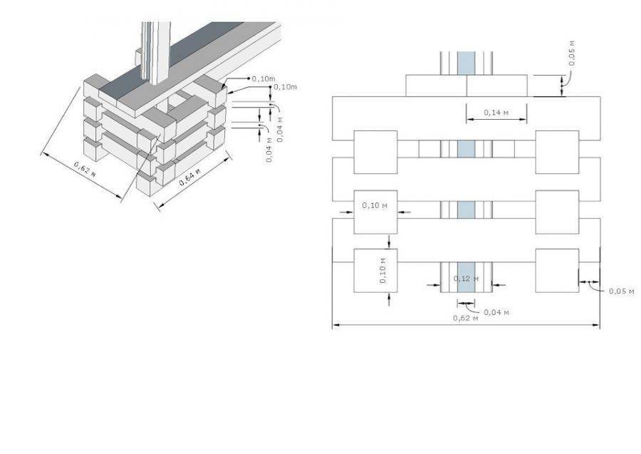 - Выкладывается стенка высотой 40 см. При этом нужно не забыть сделать опоры из брусков, расположив их вертикально. На края дерева наносится горячий битум, заворачивается в рубероид. После высыхания опоры заделываются раствором со стороны стенки.