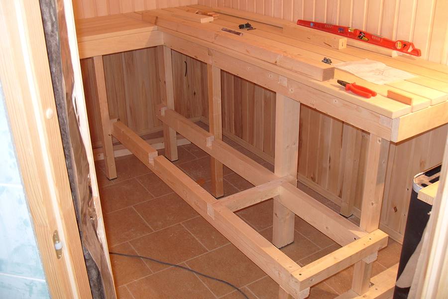 Для гидроизоляции на торцах стоек устанавливают резиновые прокладки. Крепление досок полога производится саморезами изнутри каркаса, чтобы металлические шляпки не обжигали человека во время нагрева их в парной. Между досками полога оставляется зазор для стока воды шириною 1-2 см.