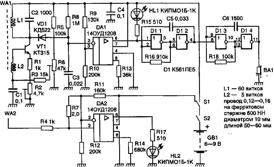 - Дополнительно операционный усилитель — компаратор DA 1 имеет порог срабатывания по сравнению с напряжением, подаваемым от делителя на резисторах R9, R10 на его второй вход. Если это значение превышено он начинает работать. Сигнал усиливается операционным усилителем до уровня достаточного, чтобы быть воспринятым генератором на D1, D2 как логическая единица и запустить его. На выход усилителя также подключен светодиод HL 1, который своим зажиганием свидетельствует об обнаружении проводки.