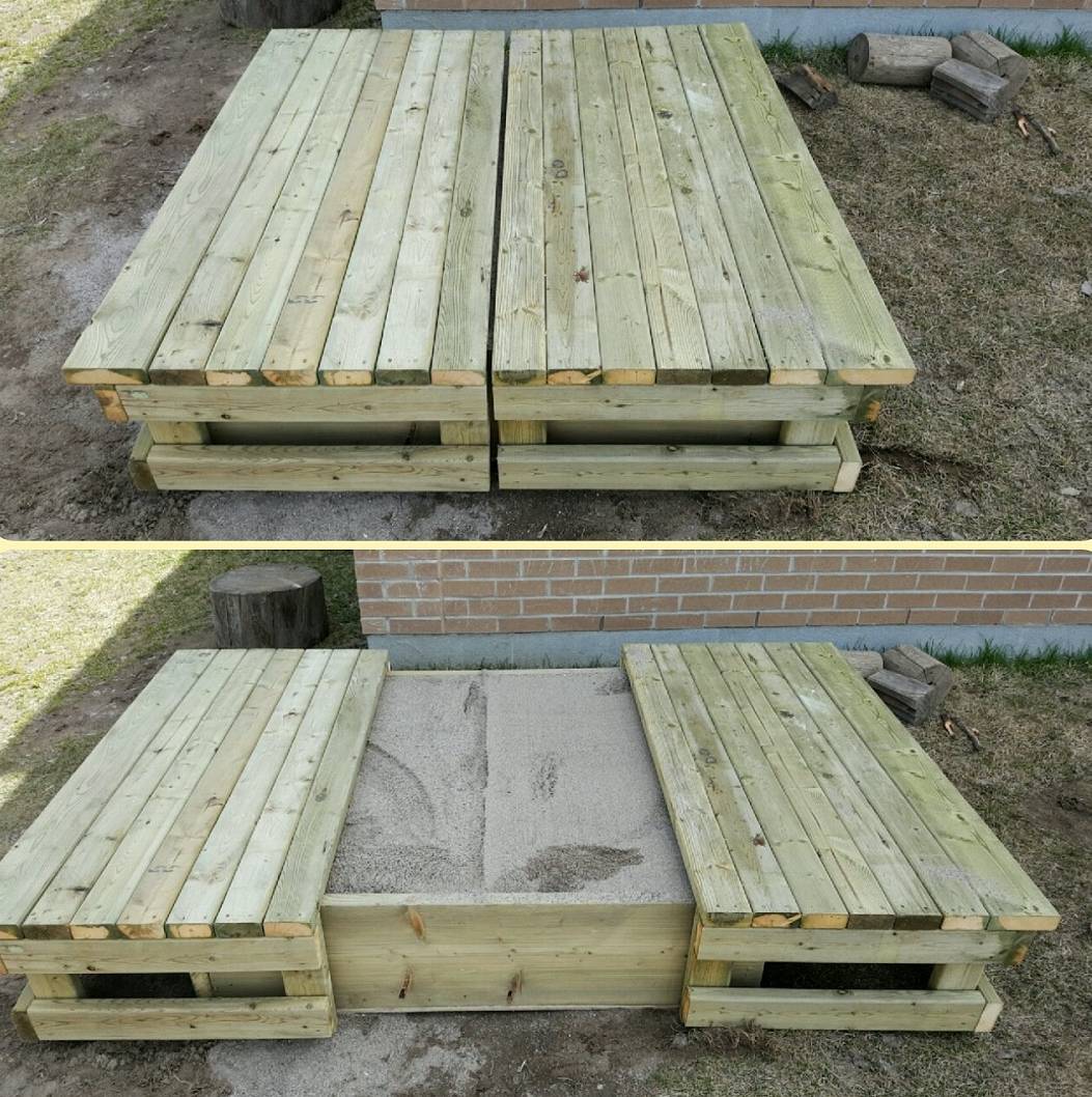 Выдвижная песочница на колесиках — очень интересная идея, когда на участке мало места. Конечно, для такой постройки необходимы базовые строительные навыки.