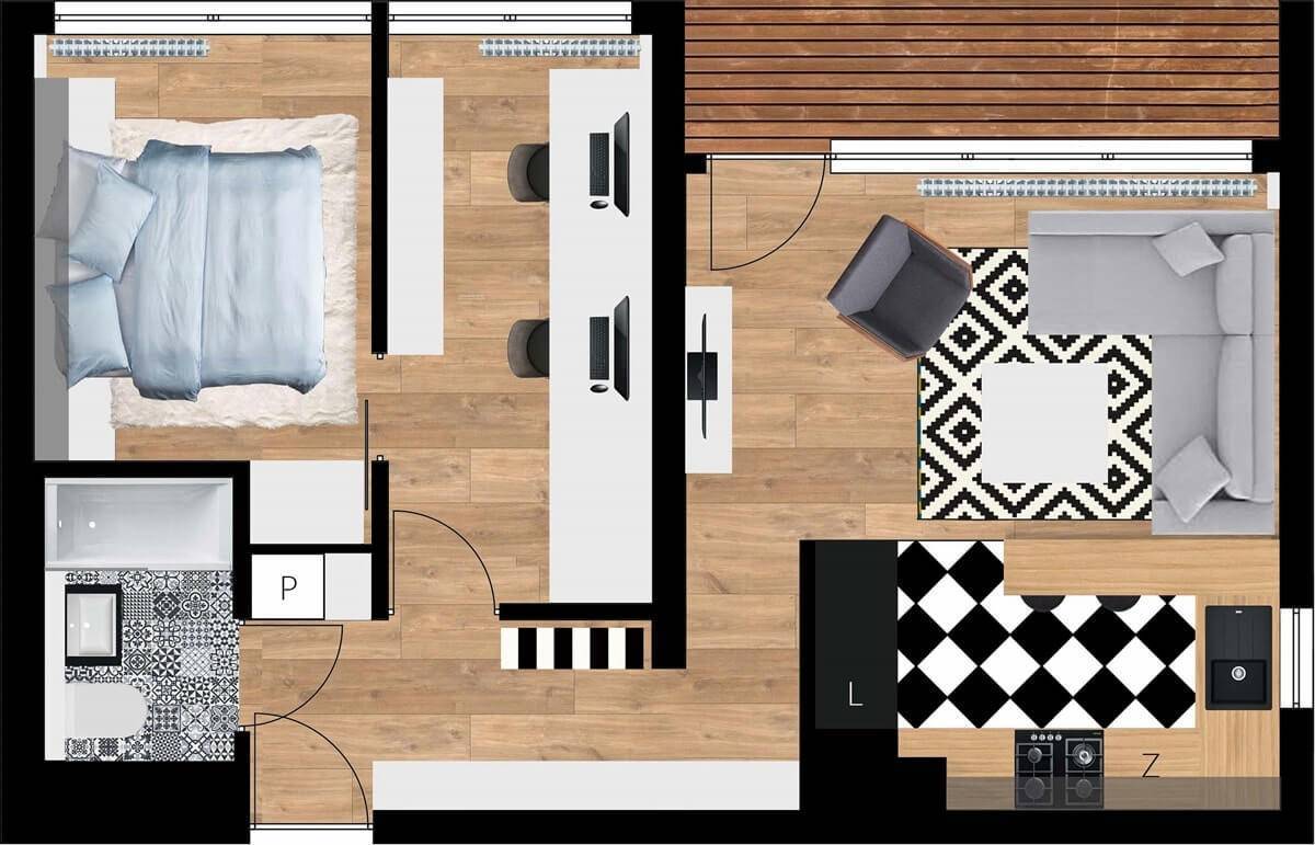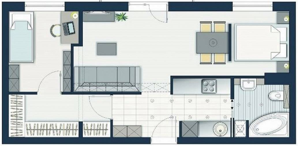 Стандартная планировка двухкомнатной квартиры современного типа выглядит так, как показано на фотографии выше. Здесь есть кухня, гостиная и отдельная спальня с гардеробом…
