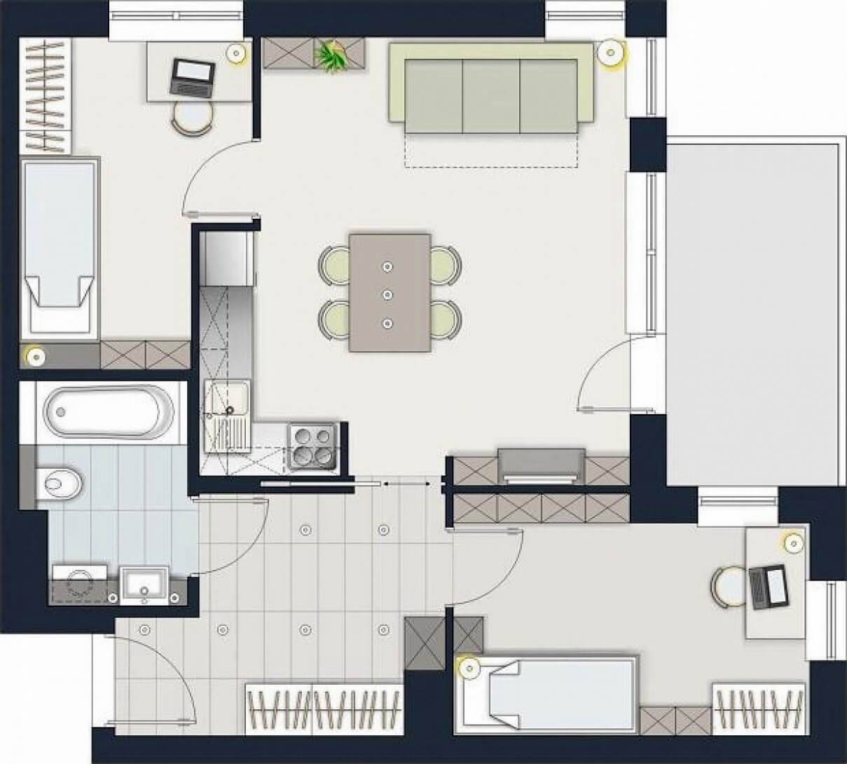 Вот ещё один удачный вариант планировки двухкомнатной квартиры. В углу гостиной выделяется место для кухни в нише, гостиная остаётся на своем месте, тогда у вас остается ещё две отдельные комнаты для двух спален!