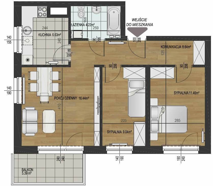 В таких квартирах удобно превращать пространство двухкомнатной квартиры в трёхкомнатную, добавляя в конструкцию детскую комнату или кабинет, если это необходимо. Площадь квартиры прекрасно позволяет это сделать.