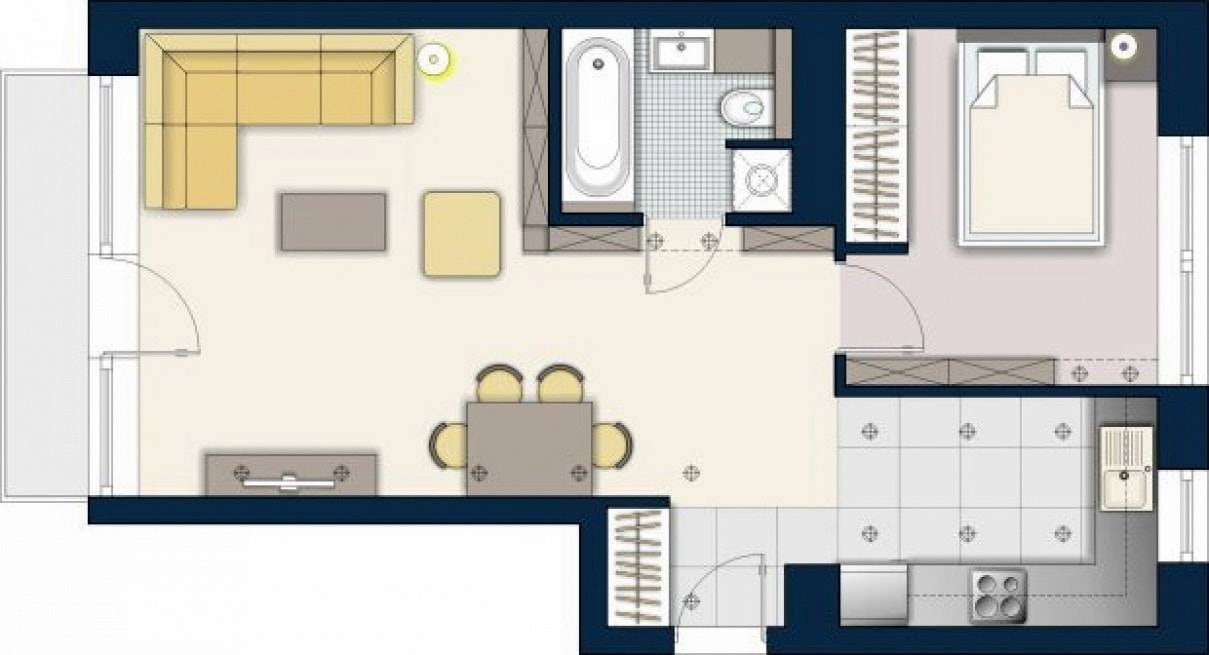 Кстати, вы можете объединить гостиную и прихожую (коридор), тогда ваша квартира станет просторнее и привлекательнее. На плане выше в зону открытой планировки добавлена ещё и кухня достаточно скромного размера. Благодаря этому приёму холл получил естественное освещение со стороны кухни.