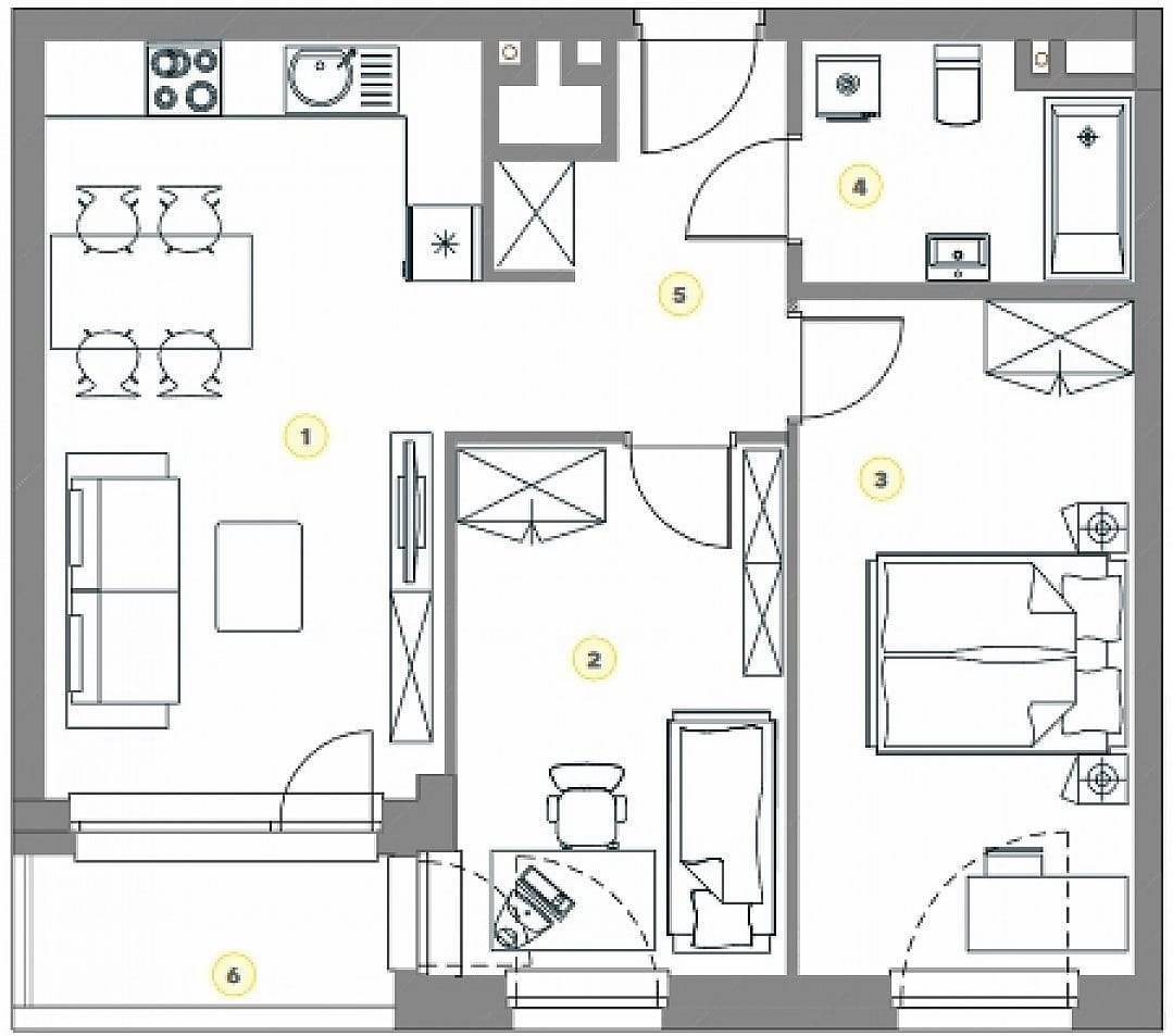 Здесь кухню перенесли из центра квартиры в правый нижний угол, в гостиную, освободив место для кабинета при спальне. Вход в спальню теперь осуществляется из кабинета, а на его старом месте расположились два маленьких встроенных шкафа.