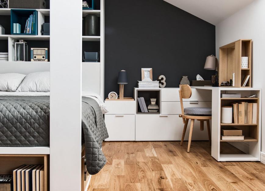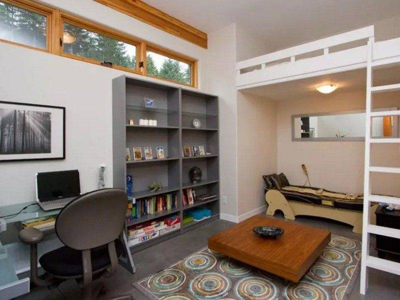 В небольших помещениях объединить несколько зон в одну. Например, спальная зона может состоять из двухъярусной кровати, верхняя часть которой используется по прямому назначению (для сна), а нижний ярус кровати можно переоборудовать в рабочую зону с компьютером и письменным столом.