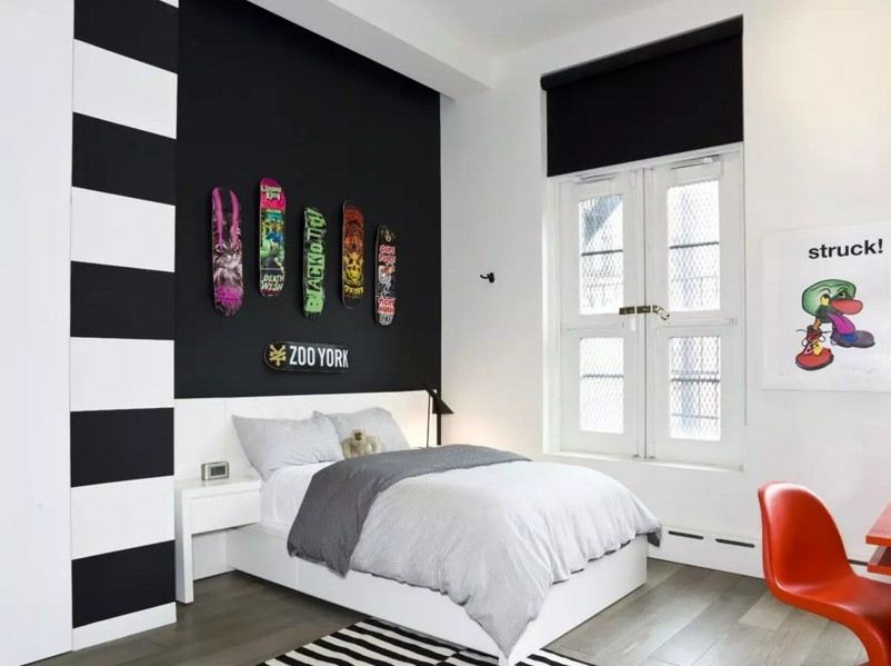 Для интерьера подростка классическим дизайнерским решением считается использование контрастной черно-белой комбинации. При таком оформлении, комната принимает более современный и стильный вид с минимальными затратами.