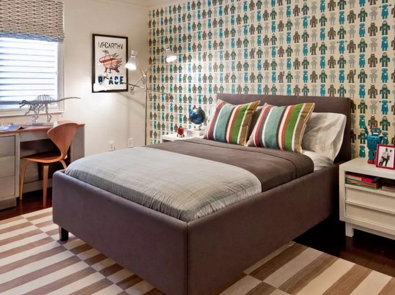 Обои, мебель, рабочее и спальное место оформляйте, принимая во внимание предпочтения ребёнка, и тем самым поддерживайте интерес сына к той или иной тематике