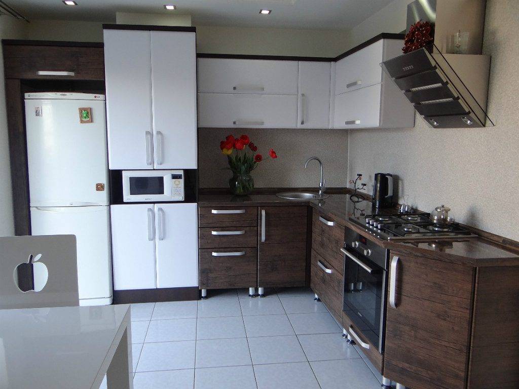 Холодильник. Во-первых, он высокий. Его удобно объединить с высоким модулем кухонного гарнитура, в котором может разместиться встроенный духовой шкаф, микроволновка или просто буфет.