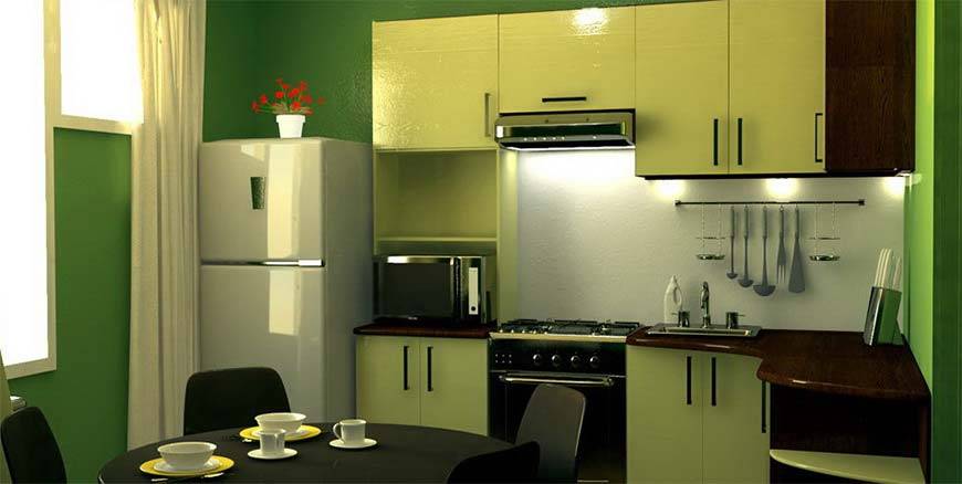 Для небольших кухонных помещений кухонный гарнитур должен иметь небольшие габариты.