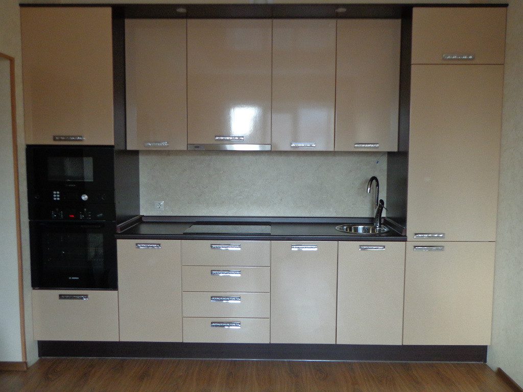 - Однорядная линейная планировка подразумевает расположение кухонного гарнитура вдоль одной стены. Такая мебель очень выигрывает в цене, так как ее не надо изготавливать под заказ с учетом индивидуальных параметров. К недостаткам можно отнести нехватку места для хранения посуды и продуктов, а также невозможность установить необходимую бытовую технику. Кухня в несколько метров с холодильником не позволяет расположить рабочую поверхность необходимой длины. Внешне интерьер выглядит стильно и компактно, а для зоны отдыха остается достаточно много места.