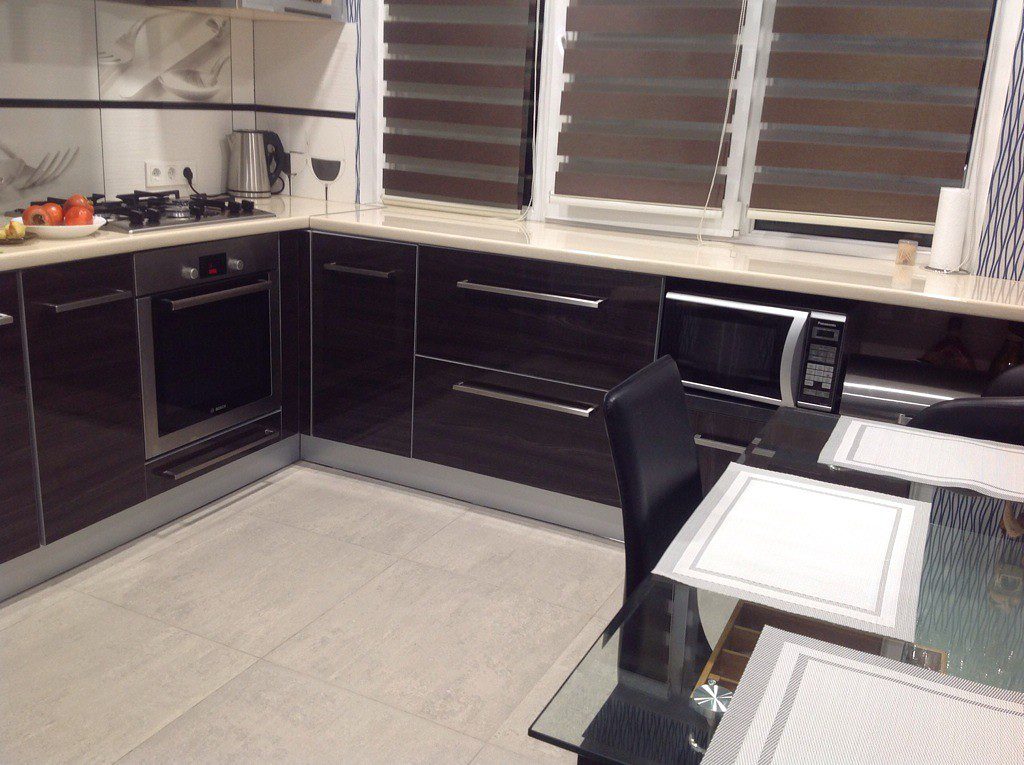 Самыми практичными вариантами для отделки пола на кухне 9 кв.м. выступают керамогранит и наливные покрытия. Оба они прослужат довольно долго, не доставляя хлопот своим хозяевам. Эстетические качества также порой поражают своим новаторством.