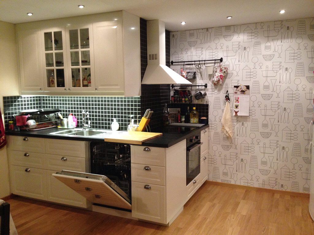 Если вы хотите зрительно удлинить помещение, то подойдут обои с горизонтальными линиями, но следует учитывать, что этот вариант хорош для кухонь с потолками высотой от 3 м. Также, в небольшом помещении стоит отказаться от большого количества мелких узоров — они «съедят» пространство.