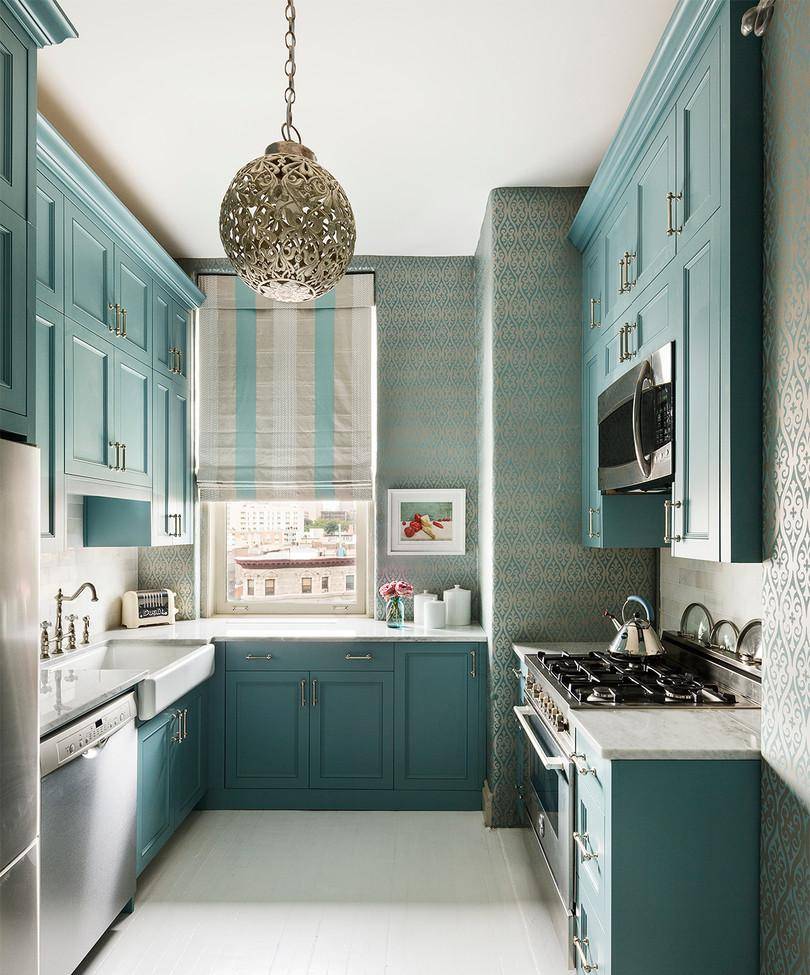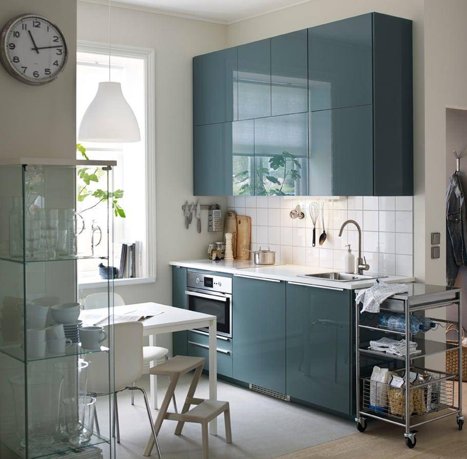 Расположение мебели вдоль одной или двух противоположных стен – оптимальное решение для узких кухонь. При этом высоту стен стоит максимально задействовать, используя навесные шкафчики и системы хранения под потолок. Но не забывайте о качестве освещения, поскольку небольшого окна в конце комнаты может быть недостаточно для необходимого на кухне количества света.