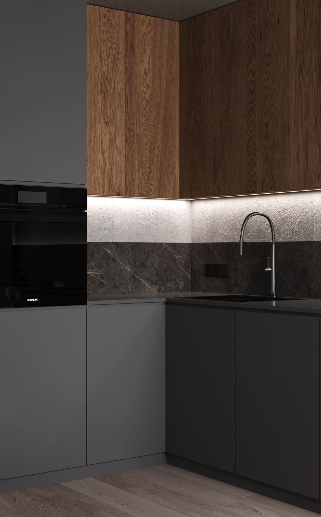 Для него дизайнер выбрала светло-серый оттенок, вписывающийся в основную палитру мебели, чтобы он не привлекал лишнее внимание