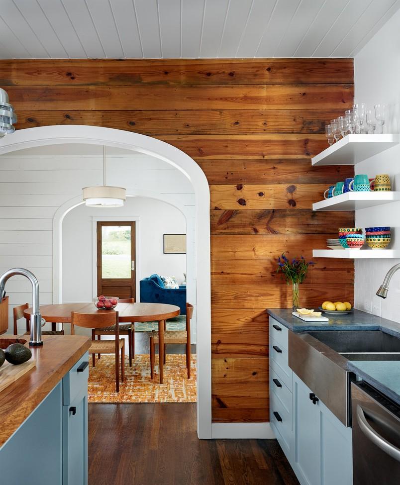 С отделкой стен можно интересно экспериментировать. Рабочую зону оформляют керамической плиткой, а в обеденном месте стены декорируют обоями или штукатуркой. Акцент стоит делать на чем-то одном. При ярком фартуке остальные поверхности должны быть однотонными. Также можно украсить участок стены возле стола фотообоями или полотнами с красивым орнаментом.