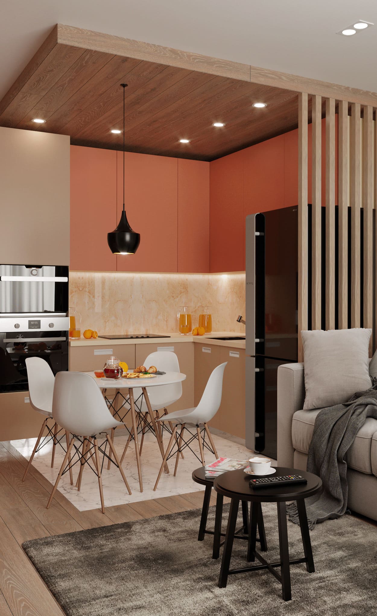 Ширмы или шторы — простой, дешевый и эффективный способ разделить зоны гостиной и кухни.