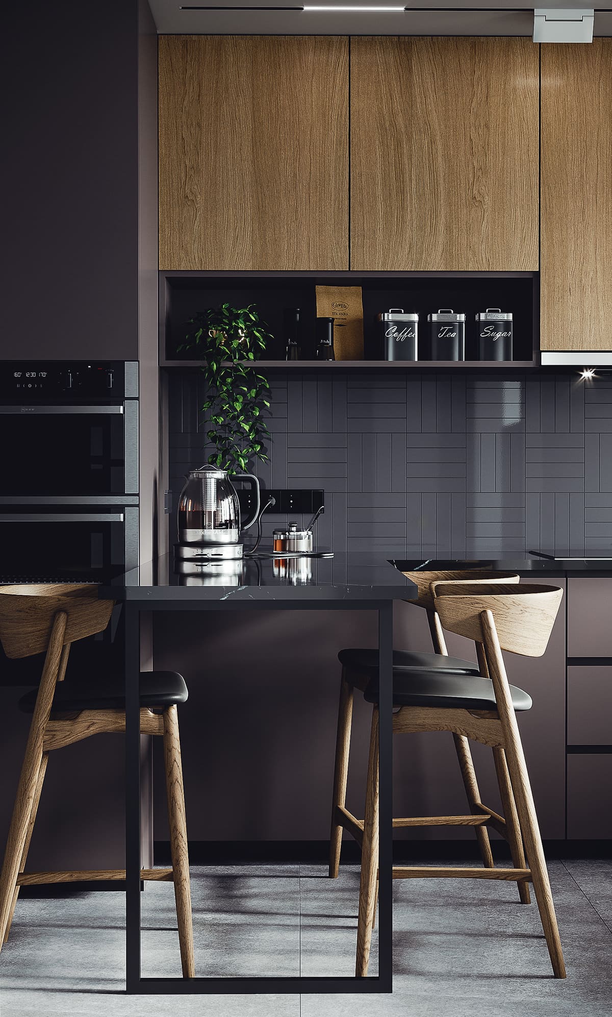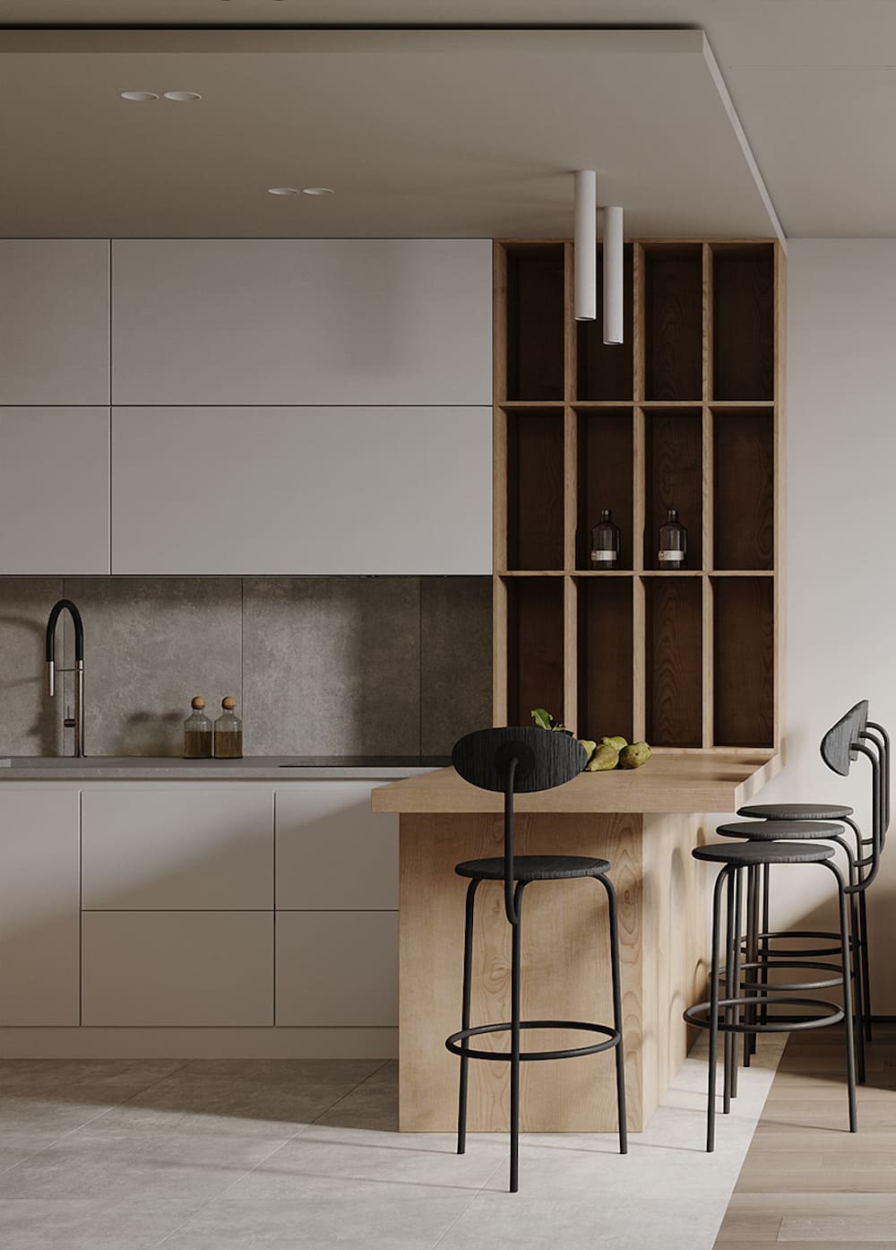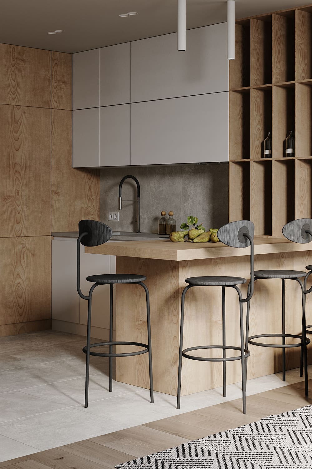 Это идеальный вариант экономии пространства. Органично смотрится сочетание стойки и прямого кухонного гарнитура. Конструкцию особенно оценят энергичные люди, которые немного времени проводят на кухне.