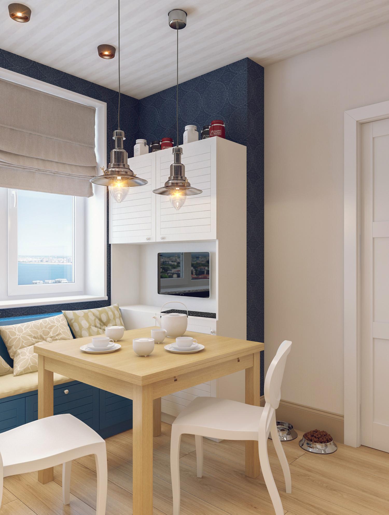 Оптимальным вариантом станет угловая или линейная планировка с обеденной зоной у окна. В случае использования балкона, у окна можно расположить барную стойку или обеденный стол со стульями. Получится стильная интерпретация средиземноморского или скандинавского стиля.