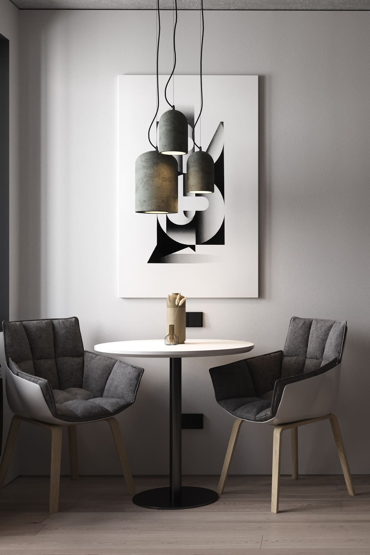 Для обеденной зоны в такой кухне отлично подойдет стол-трансформер с несколькими стульями, которые также можно при необходимости спрятать.