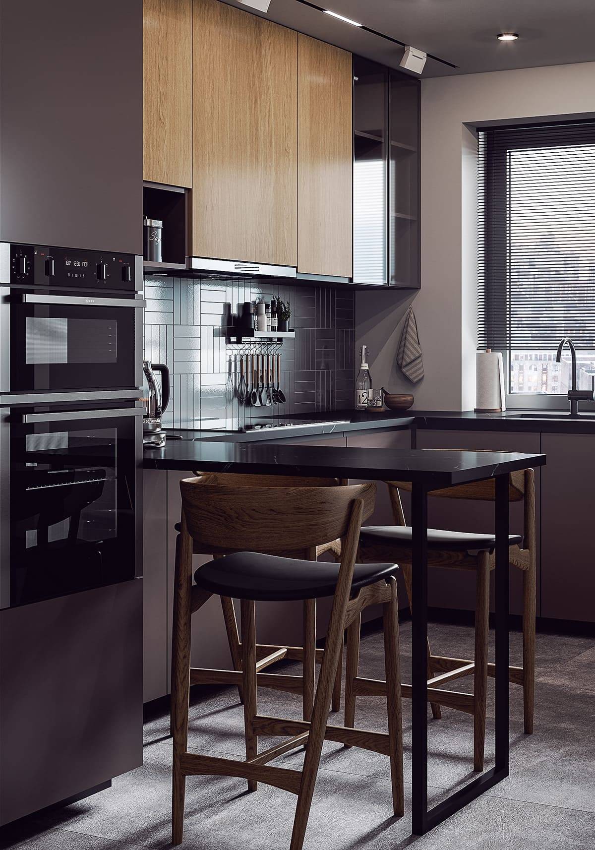 Около окна в этом дизайн-проекте разместили обеденную зону, заменив стандартный стол барной стойкой.