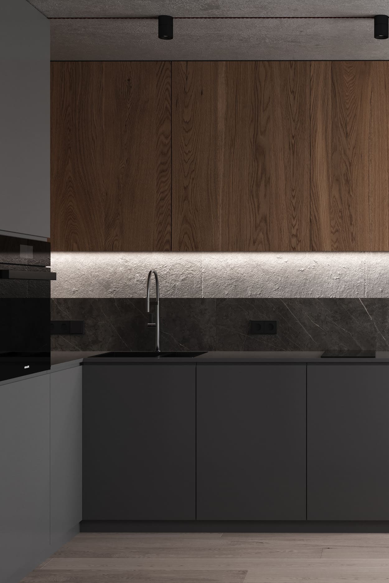 Чтобы не утяжелять интерьер, навесные шкафы пустили только по одной стене, а на другой разместили контрастную темную вытяжку. Она перекликается с мойкой и другой бытовой техникой: плитой, духовкой и СВЧ-печью. Таким образом сделаны акцентные точки на общем нейтральном фоне.