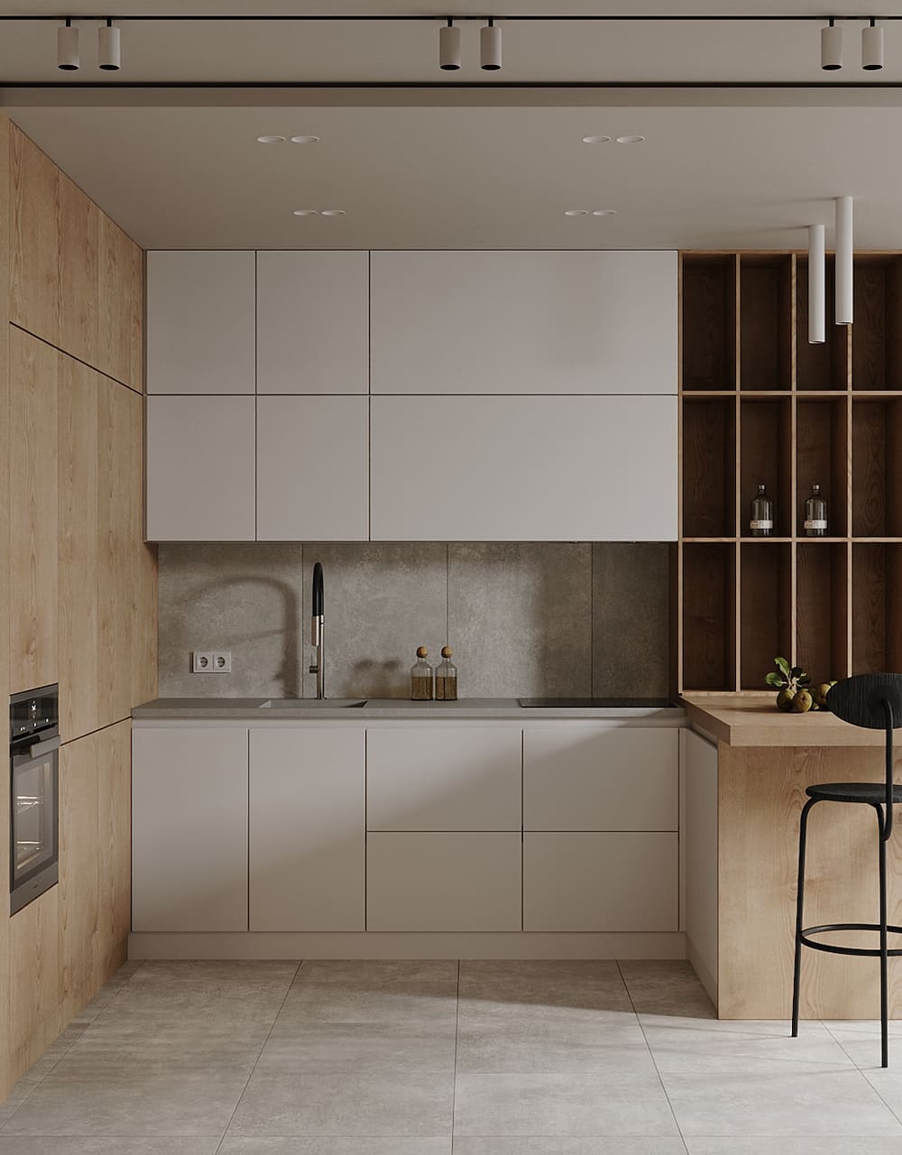 Минимализм будет очень актуален на такой кухне. В этом стиле часто используются светлые цвета и четкие линии. Чаще всего применяются серые и белые оттенки, но это не говорит о том, что использование других тонов недопустимо.