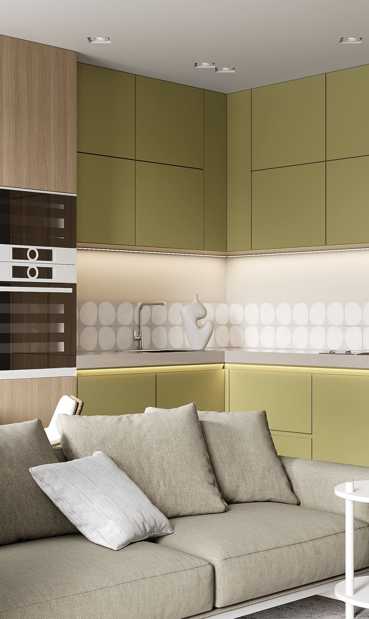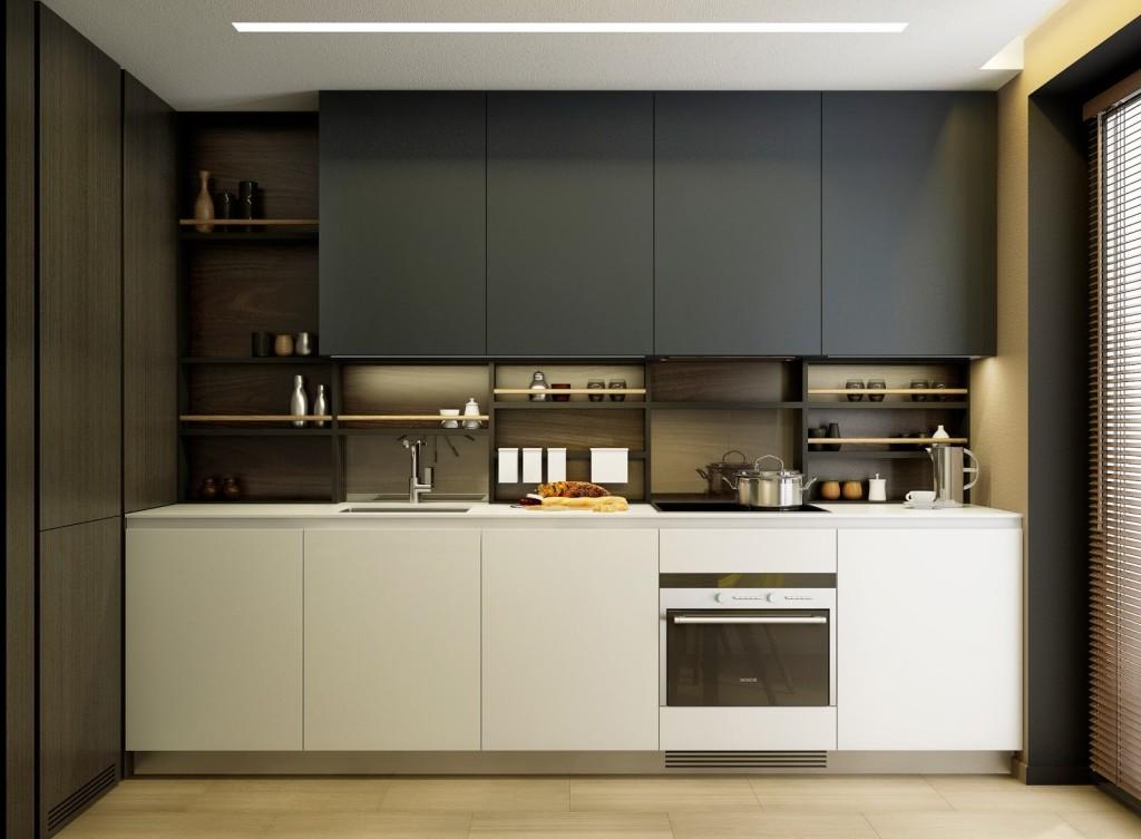 Линейные кухни располагают на одной линии. Здесь экономится площадь помещения и проще обустроить разные зоны. При выборе модели достаточно знать длину стены и желаемую глубину мебели. Такие гарнитуры очень практичны – все находится под рукой, а на приготовление пищи тратится меньше времени.