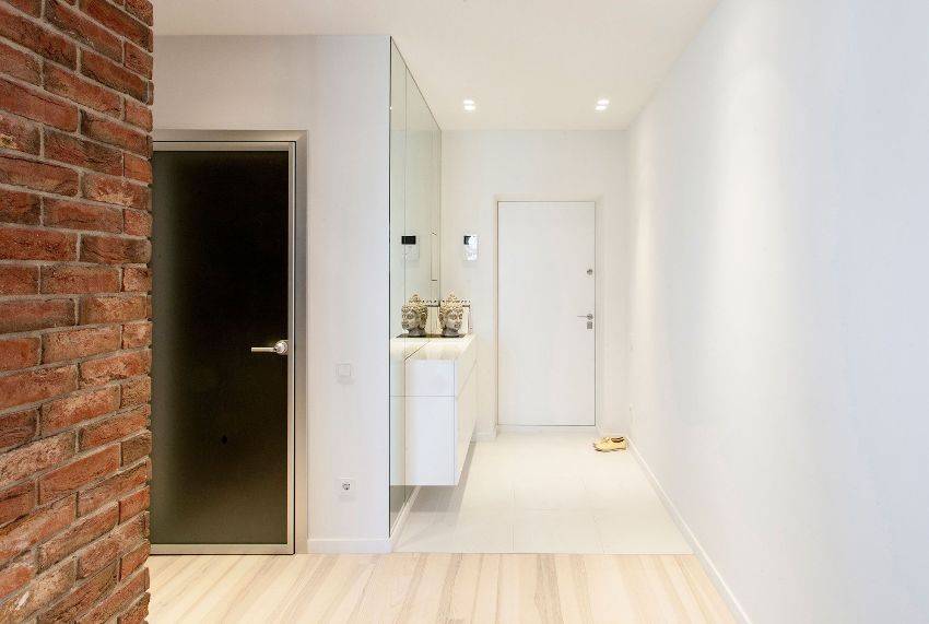 Наиболее просторной выглядит миниатюрная прихожая с межкомнатными дверцами, украшенными зеркальными и стеклянными вставками. Привнести в помещение ещё больше света можно посредством проёмов без дверей и арочных конструкций, декорированных занавесками.