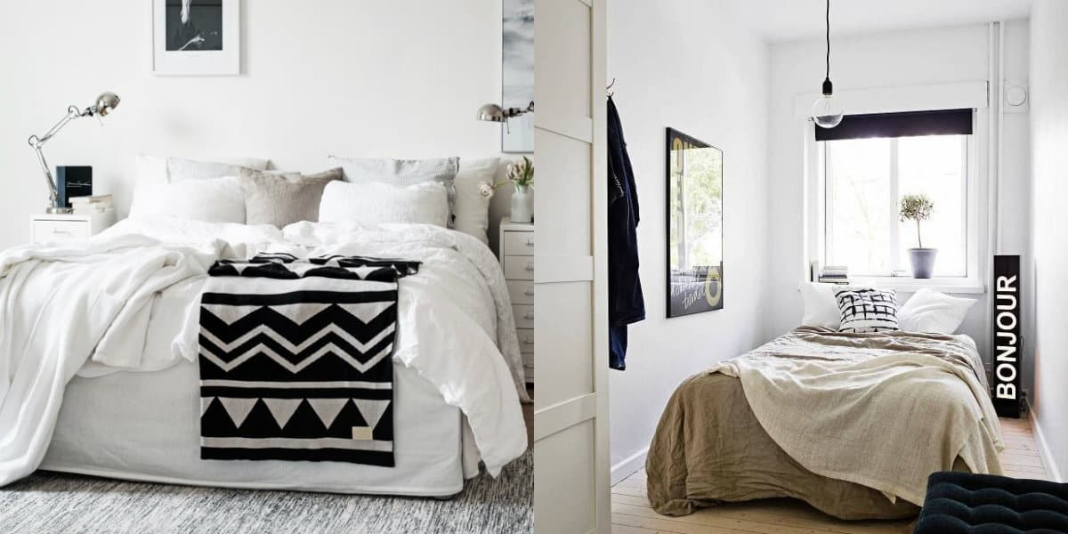 Убрать лишнюю мебель (стулья, книжные полки, слишком много декора и подушек), оставив только необходимое — кровать, тумбы и шкаф.