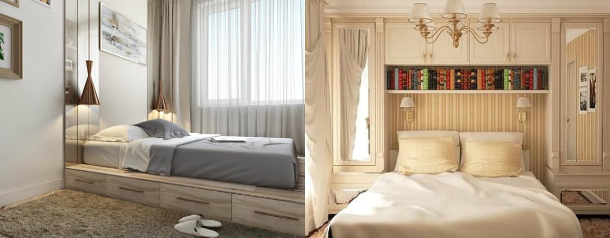 Важно! Не устанавливайте кровать с балдахином, так как это визуально делает комнату еще меньше. Интерьер спальни в маленькой комнате, фото. Не только кровать является предметом мебели в спальне