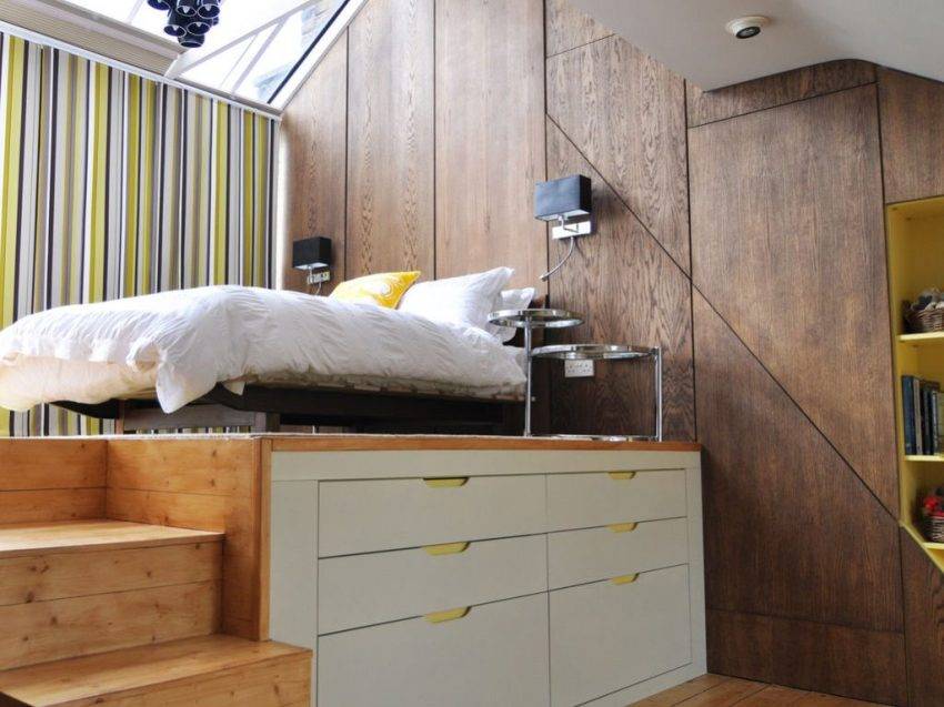 Удобный вариант — кровать без ножек, она зрительно делает комнату чуть выше.