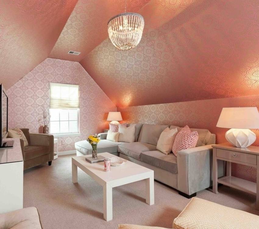 - грамотно задействовать в дизайне все элементы мансарды: косые стены, подкосы, стойки, балки и скаты крыши;