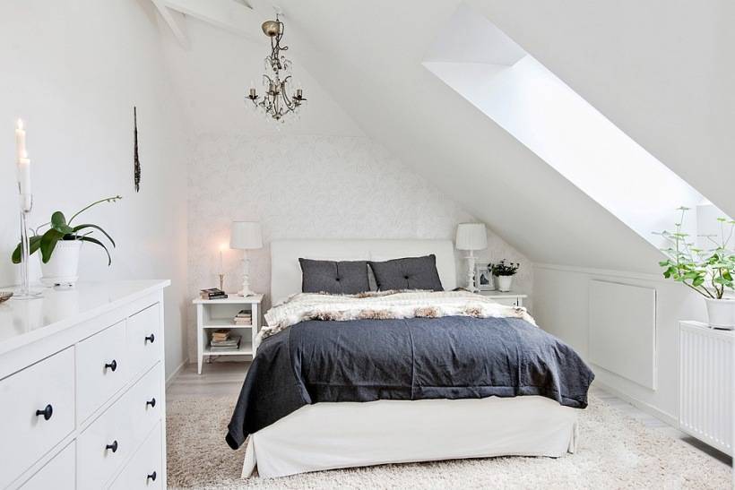 Комната очень маленькая, и в ней не так много света? Спальня с белой мансардой — лучшее решение в этом случае. Вы можете разнообразить ее аксессуарами — модные светильники на тумбочках будут великолепны. Используйте постельные принадлежности, чтобы обогатить яркий декор — в комнате, где преобладает белый цвет, наволочки с ботаническим мотивом будут идеальными.