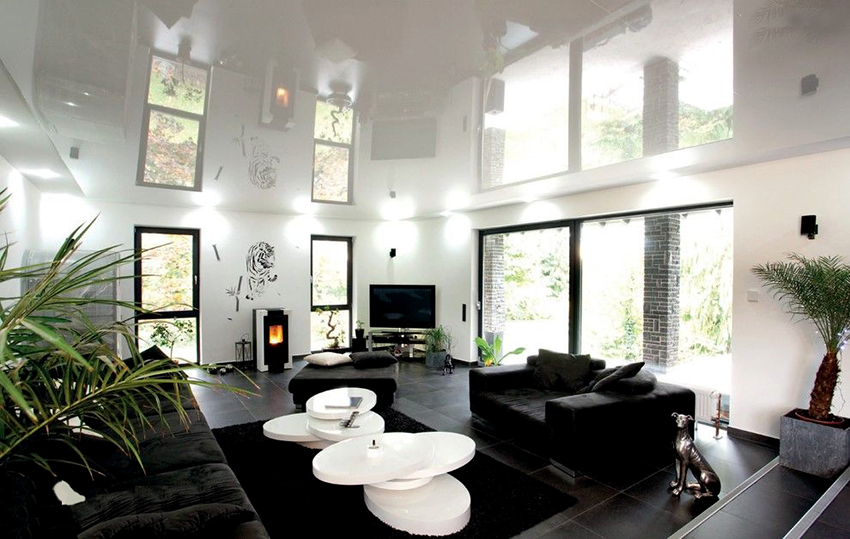 Сердцем дома является гостиная, в ней собирается вся семья, чтобы весело провести время или отдохнуть. Потолок играет важную роль в общем дизайне, поэтому он не должен «выпадать» из интерьера помещения.