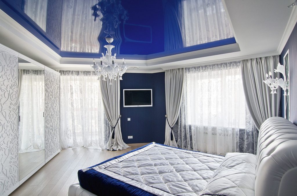 - Синий. Успокаивает, расслабляет, напоминает море. Синий потолок идеально подходит для спален и комнат отдыха.