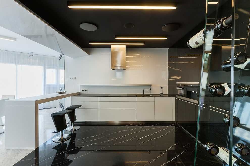 Такое оформление подходит не для каждого интерьера. Тщательно продумайте дизайн своей кухни и подумайте о том, насколько хорошо подобное оформление потолка впишется в общую картину. Ниже приведено несколько фото примеров того, как глянцевый черный натяжной потолок смотрится на кухне. Они помогут получить общее представление о такой отделке.