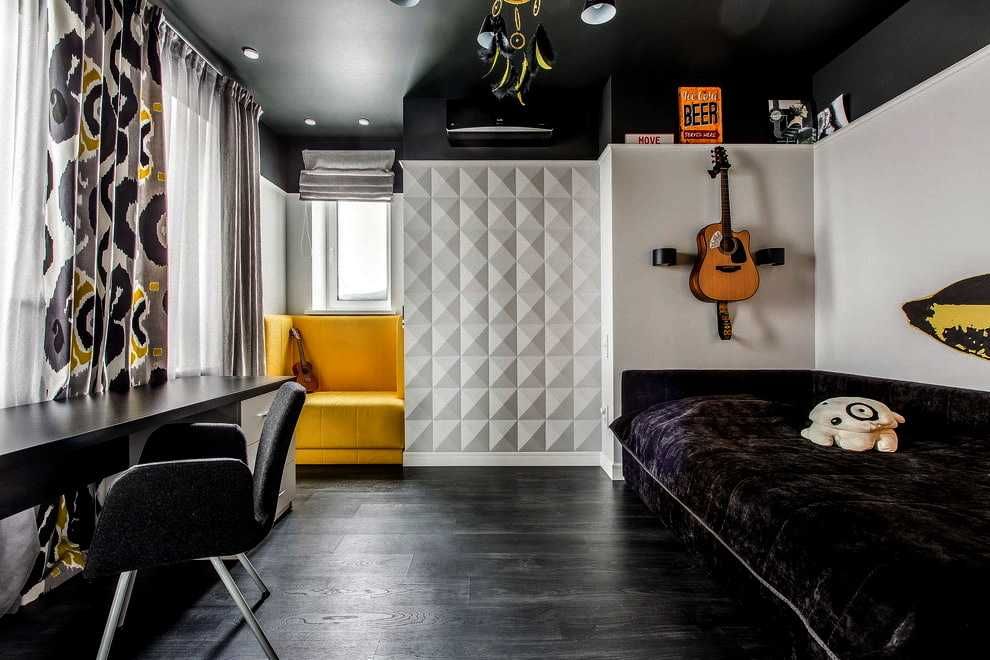 2.5 Чёрный потолок в сочетании с чёрным полом создаёт эффект визуального отсечения верхней и нижней частей интерьера, заставляя взгляд человека сосредоточиться на центральной части. Самое сложное в данном случае освободить пол, чтобы его можно было покрасить полностью, иначе предметы мебели и декора других цветов будут отвлекать.