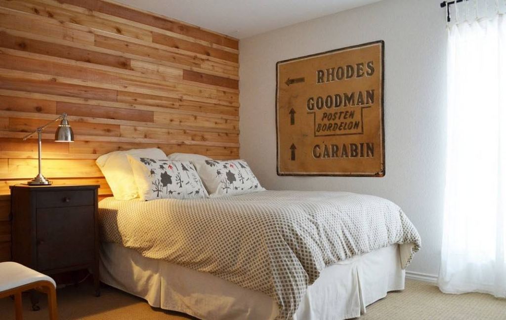 Кроме того, отличным решением будет оформить одну стену, например, за изголовьем кровати, под дерево, а другие стены покрыть однотонными обоями.