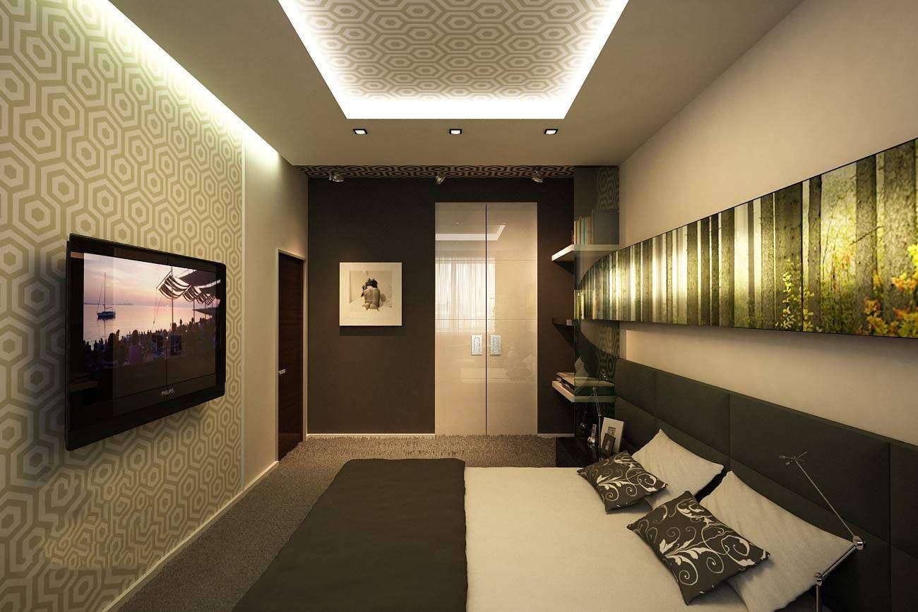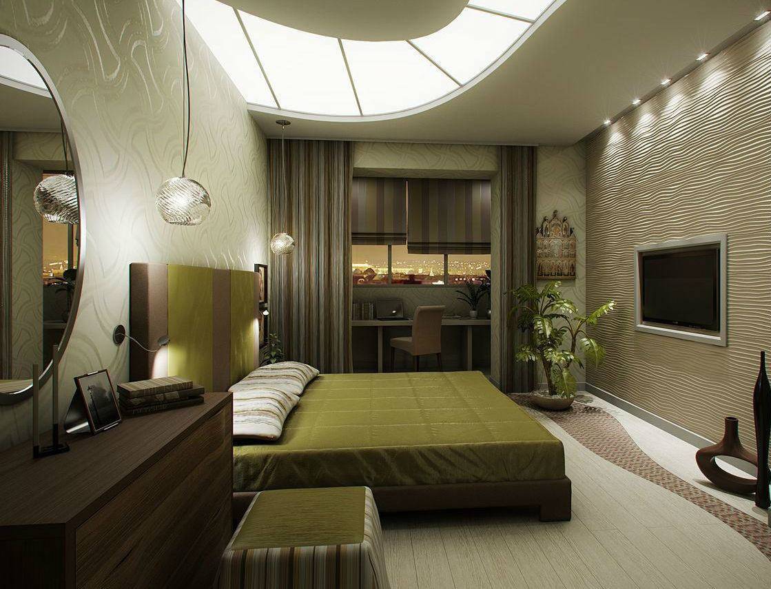 Потолок в дизайне современной спальни сделайте открытым, чистым (фото ниже). Избегайте нависших балок, реек. Максимально ограничьте вычурные гипсокартонные изгибы. Потолок создается для одной звезды – люстры. Наличие оригинальной, богатой люстры – один из ярких пунктов комплексного освещения. Подробнее о свете в современной спальне еще поговорим.