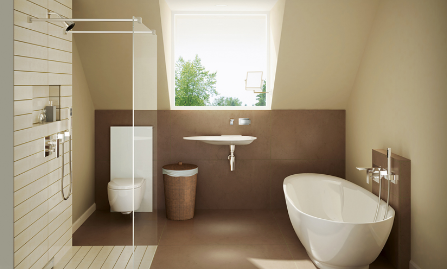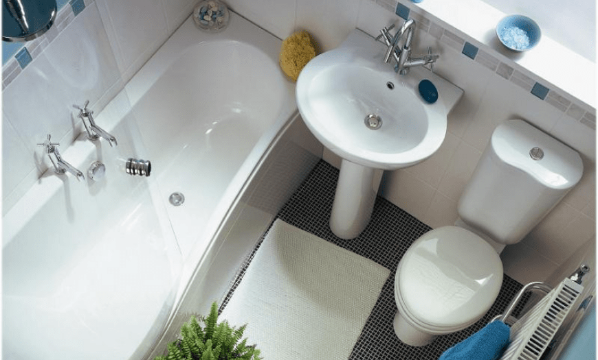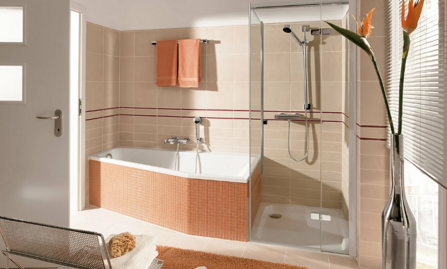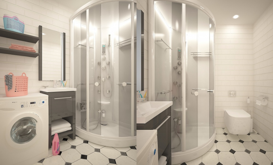 При достаточных размерах компактного помещения монтируют угловую ванну. Вплотную ставят миниатюрную душевую кабинку, оборудованную полукруглой дверкой. В просторной комнате удается поместить эти сантехнические устройства раздельно.