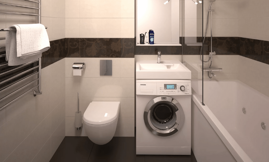 Хорошо экономит пространство перенос стиральной машинки из ванной комнаты в кухню или коридор. Если это невозможно — выбирайте узкие модели с вертикальной загрузкой.