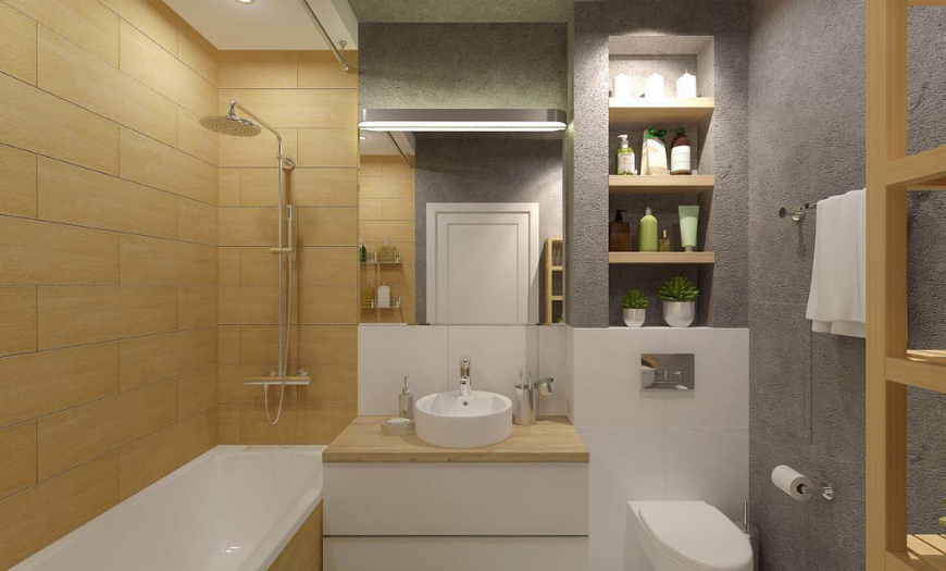 Небольшой метраж – большие возможности по экспериментам с дизайном маленькой ванной комнаты, совмещенной с туалетом. Те же отделочные материалы можно применять и для обособленного гигиенического помещения.