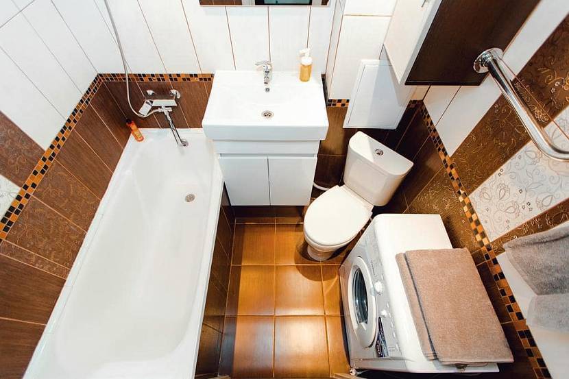 Еще вариант — установка сидячей ванны. В них не получится вытянуться во весь рост, но релакс с сидячем положении — тоже неплохо. В этом случае можно найти место под установку небольшой стиральной машины — под раковиной.